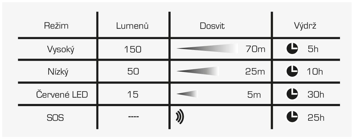 Výdrž: 5h vysoký výkon, 10h nízky výkon, 30h červenej LED