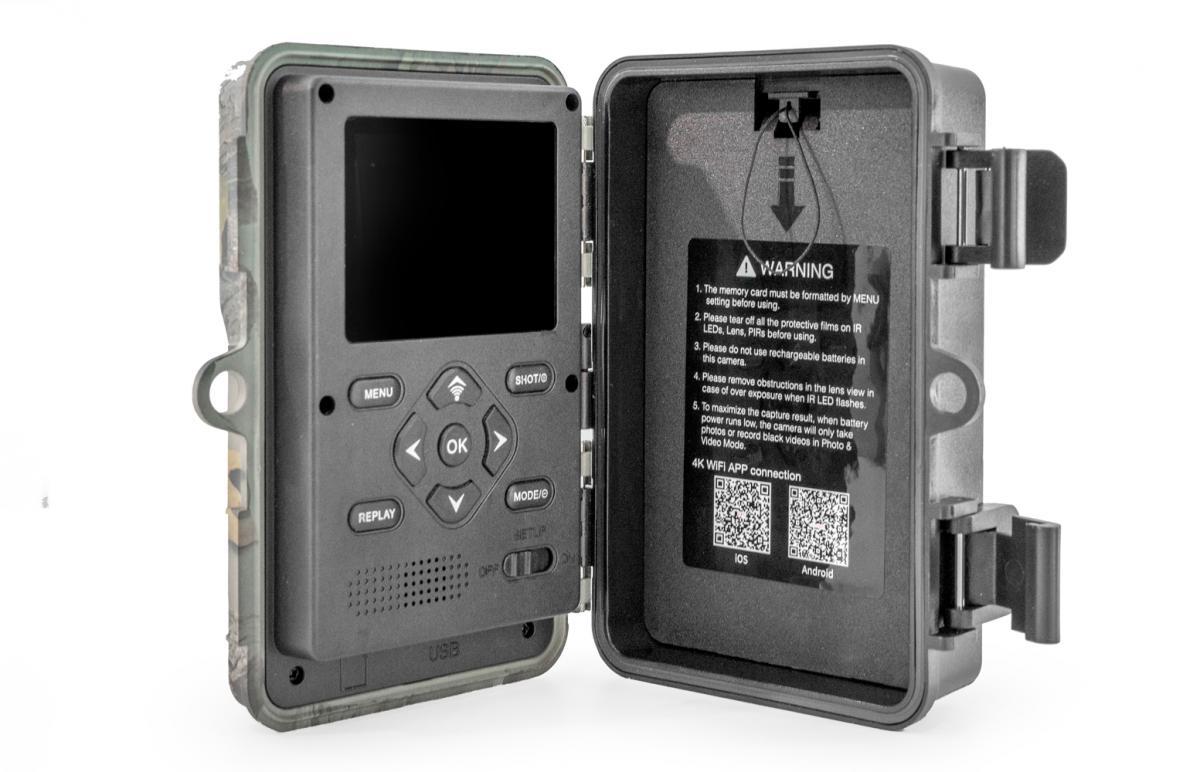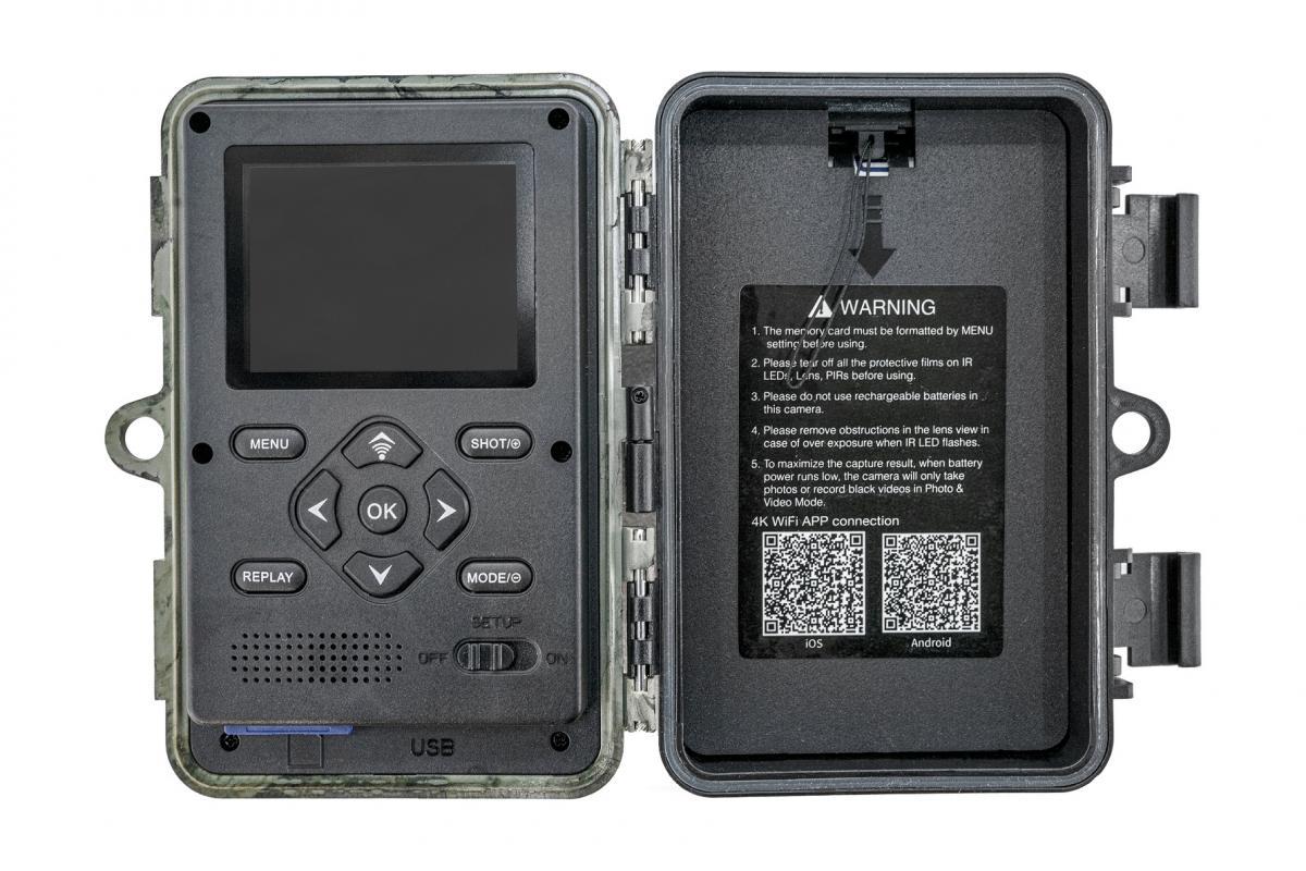 - Funkce Wifi APP - přes mobilní zařízení můžete pořizovat fotografie a videa, prohlížet, stahovat a mazat pořízené fotografie a video soubory, měnit nastavení fotopasti, kontrolovat kapacitu baterie a paměti (kompatibilní zařízení: iOS 9.0, Android 5.1 a vyšší)
