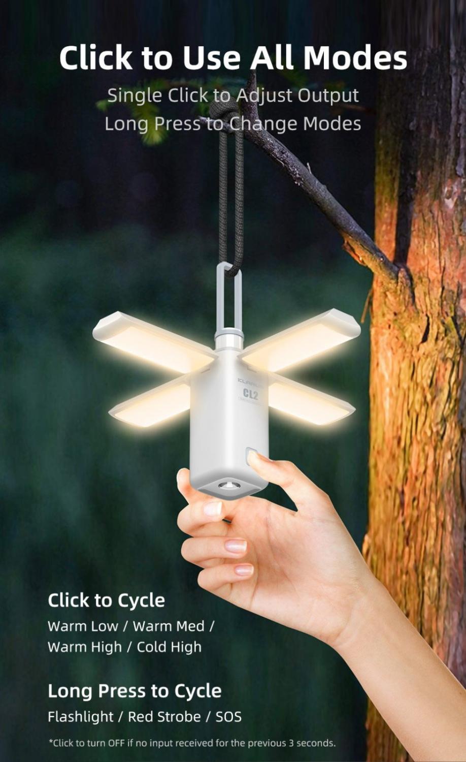 Kempingová svítilna Klarus CL2 má k dispozici 7 světelných režimů - bílé studené světlo (vysoký výkon) / bílé teplé světlo (vysoký výkon) / bílé teplé světlo (střední) / bílé teplé světlo (nízký) / režim svítilny / SOS / červené blikání. Různé teploty barev osvětlení společně s nastavitelnou úrovní jasu pomohou chránit váš zrak před dlouho trvajícím oslněním a únavou.