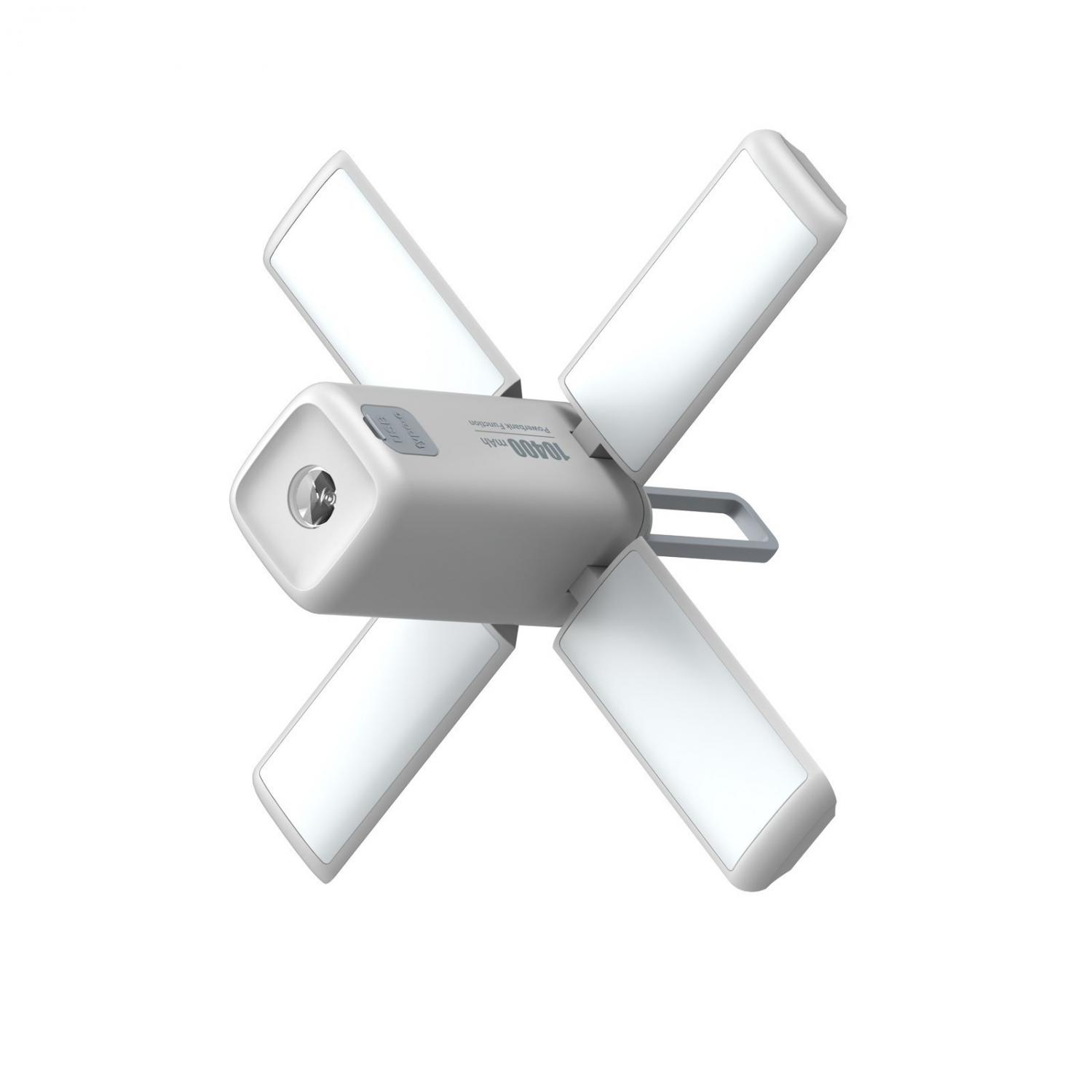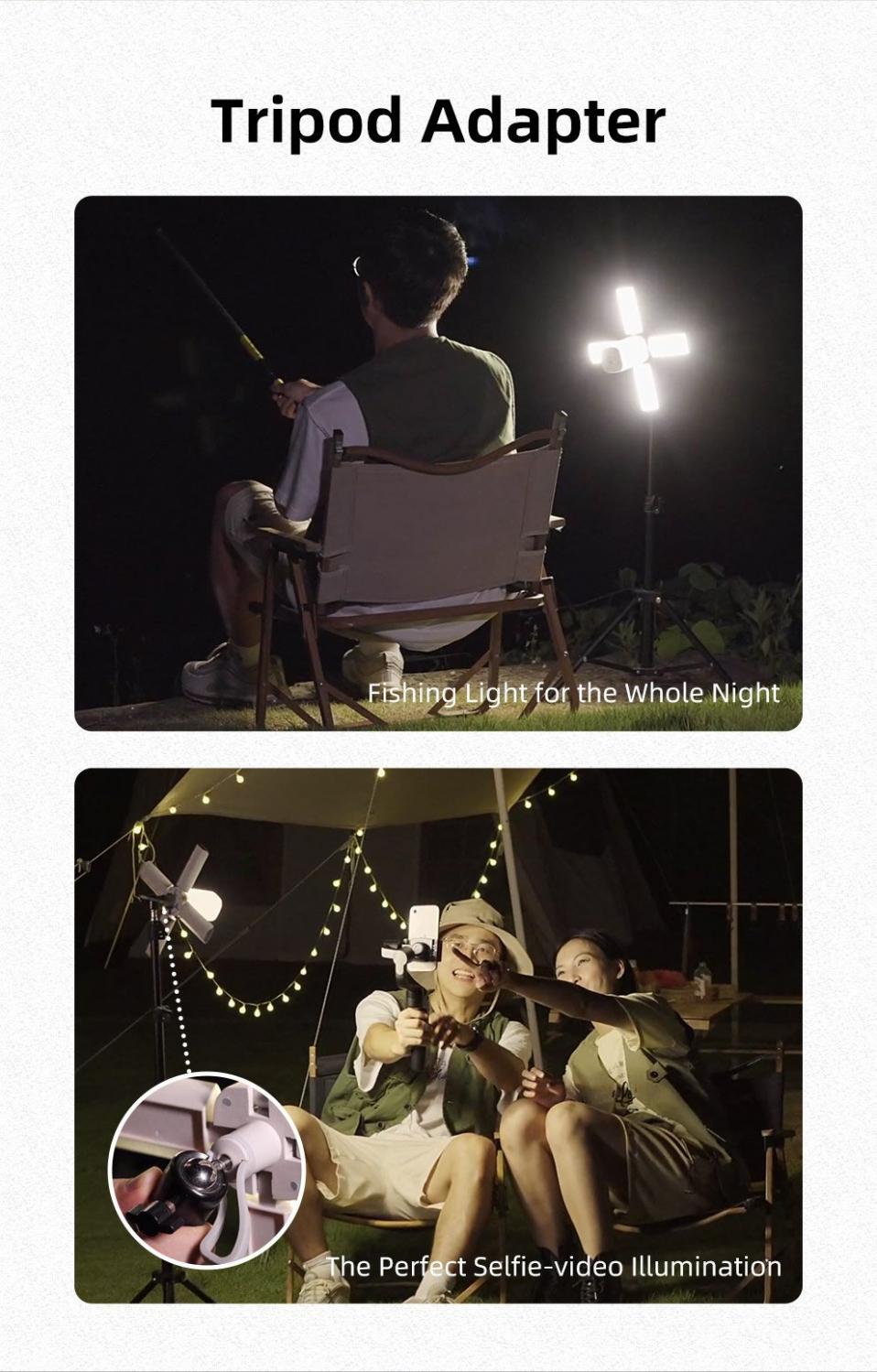 Skládací kempingová svítilna je vybavena 4 LED panely o maximální světelném výkonu 750 lumenů, které jsou samostatně polohovatelné až o 90°, díky čemuž lze libovolně měnit směr osvětlení a tím se vyhnout nepříjemnému oslnění nebo rušení okolí. Díky variabilitě rozkládání a praktickému držadlu lze svítilnu jednoduše zavěsit ve stanu nebo třeba umístit na stůl.