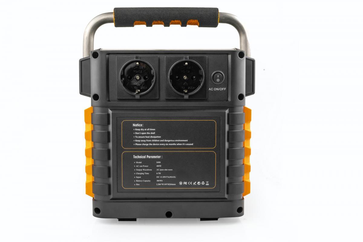OXE Powerstation S400 je venkovní, přenosná, multifunkční, dobíjecí elektrocentrála 400W/386Wh. Uvnitř powerstation se nachází vysokokapacitní Lithium-ion baterie s vysokým výkonem pro dlouhodobý provoz. Nízká hmotnost (4,5 kg) předurčuje bateriový generátor pro použití na cestách, při campingu, na zahradě a kdekoliv jinde, kde nejste v dosahu elektrické sítě. Díky různým typům výstupů lze elektrocentrálou dobíjet většinu elektronických zařízení. Elektrocentrálu lze dobít pomocí síťového adaptéru, autonabíječkou nebo solárním panelem. Pro snadné přemístění slouží úchyt v horní části nabíjecí stanice.