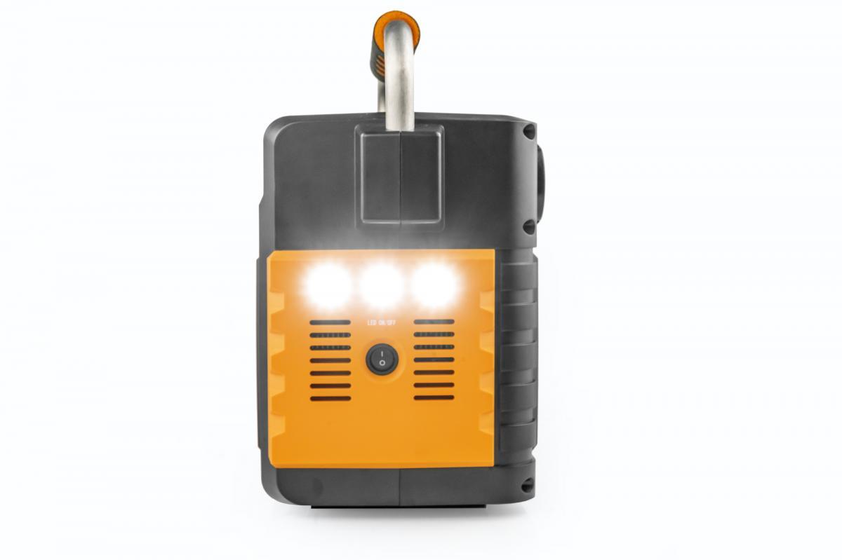 Jmenovitý výkon: 400W Maximální výkon: 800W (krátkodobě) Výstupní porty USB: 2x 5V/2A Výstupní zásuvka: 3x AC 230V/50Hz (čistá sinusoida) Výstupní port DC5525 : 2x DC 9~12,6V/8A, max 15A Výstupní CL port (autonabíječka): 1x DC 9~12.6V/8A, max 15A Vstupní port DC5521 (pro dobíjení z elektrické sítě, autonabíječkou nebo solárním panelem): 1x DC 13-30V/7A (max), dobíjení pomocí solárního panelu 18V, max 90W Doba nabíjení: 6 - 7 hodin Kapacita baterie: 385.56Wh (10.8V/35.7Ah) Typ baterie: Lithium-ion Ochrana proti: přepětí, nízkému napětí, přehřátí, přetížení a zkratu LED přísvit: 3x 1W Rozsah provozní teploty: 0°C ~ 45°C Rozsah teploty pro skladování: -20°C ~ 60°C Velikost: 206*149*266 mm (D*Š*V) Hmotnost: 4,5 kg