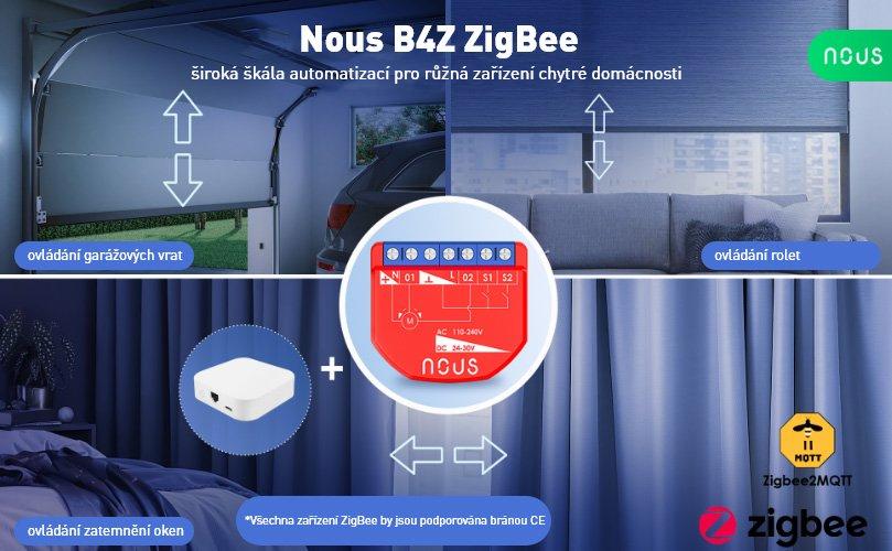 Chytrý ovladač garážových vrat/žaluzií/rolet Nous B4Z ZigBee je určen pro usazení pod vypínač, což umožňuje jejich chytré ovládání pomocí aplikací Tuya/SmartLife nebo HomeAssistant, ale současně je zachována možnost tradičního manuálního ovládání pomocí vypínače. Chytrým ovladačem Nous B4Z ZigBee lze vytvářet automatizace na základě denní doby, vlastního časového plánu nebo jiných scénářů ve spolupráci s dalšími prvky chytré domácnosti.