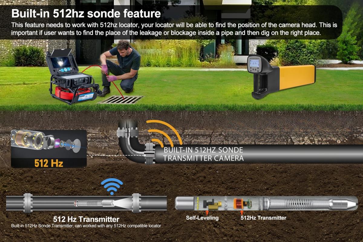 • 40metrový tlačný kábel: O priemere 6,8 mm s kamerou ø23 mm, Full HD rozlíšením 1080p AHD a samonivelačnou technológiou pre automatické vyrovnanie horizontu. Kábel zvláda 90° ohyby v potrubiach s priemerom 45 mm.