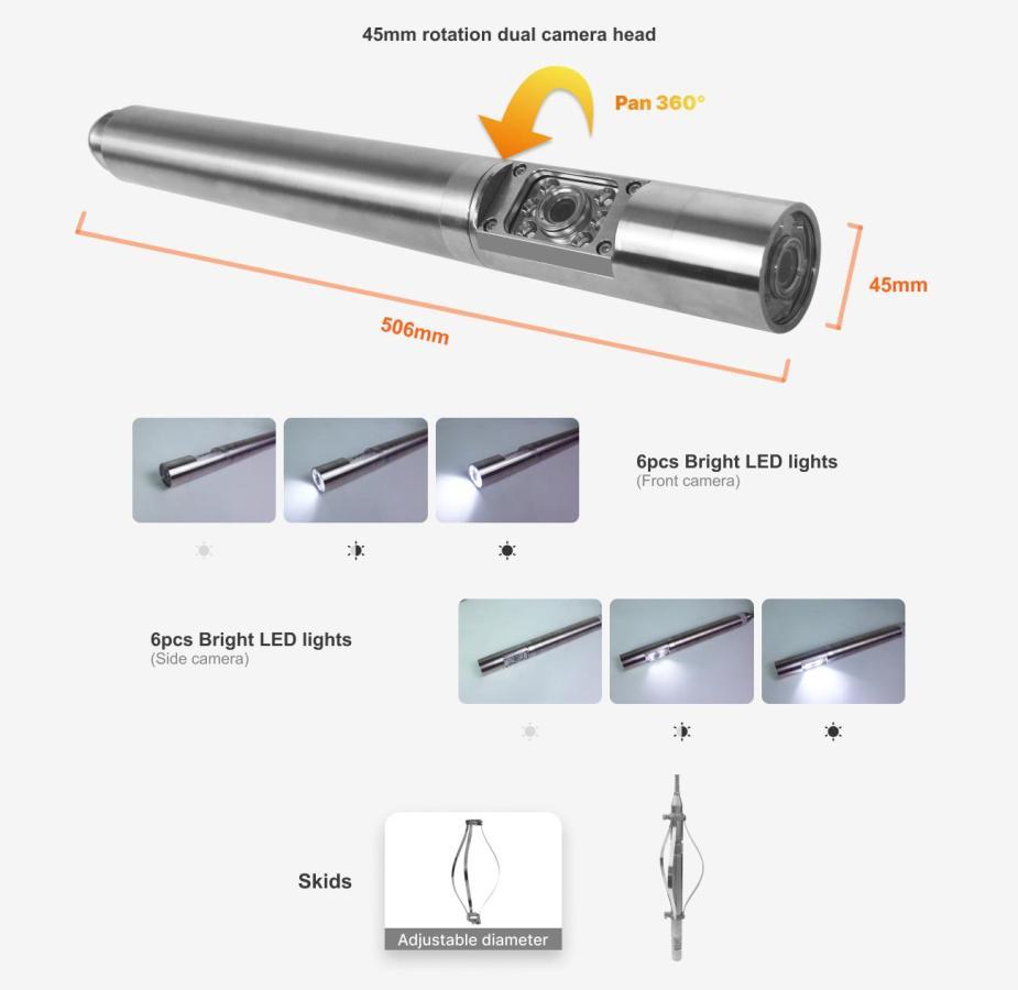 - Duální HD kamera: Obsahuje boční kameru s funkcí rotace o 360 stupňů pro komplexní snímkování bočních stěn a kameru směřující dolů s pevným širokoúhlým objektivem pro jasný pohled do vrtu.